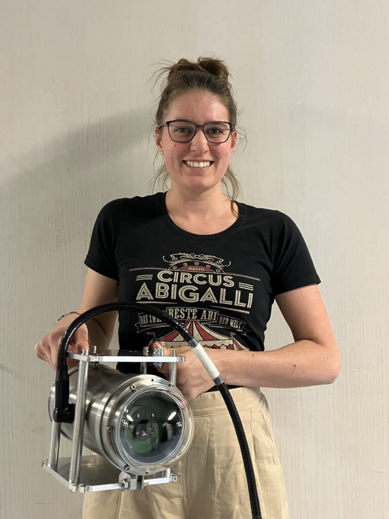 Although relatively new to the IceCube Upgrade project, the local research group led by Prof. Kopper contributed to several deployed instruments . As part of her doctoral work, Anna Eimer developed the so called “LOMlogger”, an innovative instrument that maps the vertical layering of the ice. The device combines a horizontally oriented laser light source (based on a „POCAM“ from TU Munich) with a sensor module two meters below (based on a „LOM“ design from the University of Madison-Wisconsin, USA), measuring the intensity of scattered light to reveal subtle ice structure.